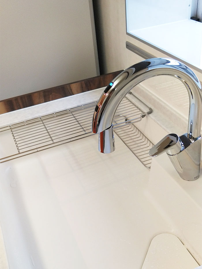 よく料理をされる綺麗好きな奥様が、ストレス無く作業ができるキッチンにしたいとのことで、タッチレスの水栓やキッチンライトを取り入れました。