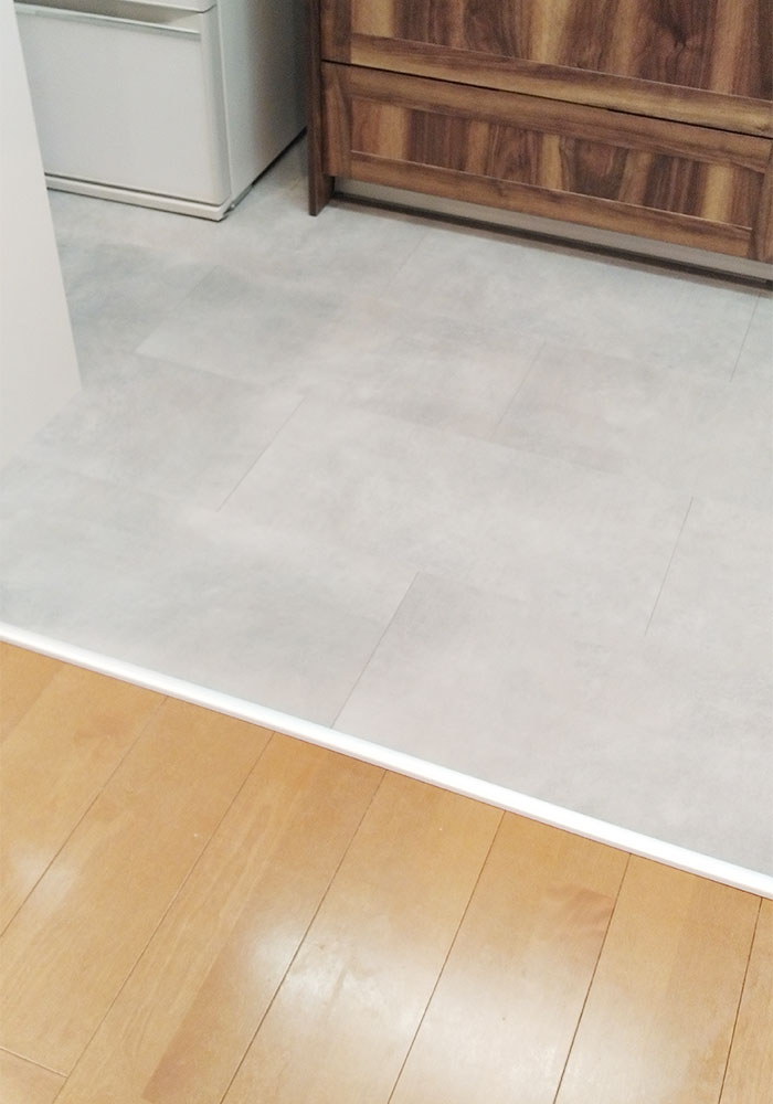 間取り変更に伴いフローリングの粗が出てきてしまうため、思い切ってキッチンが設置される空間だけモルタル調の床材で雰囲気を変えました。