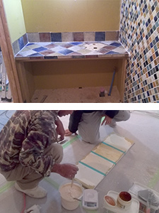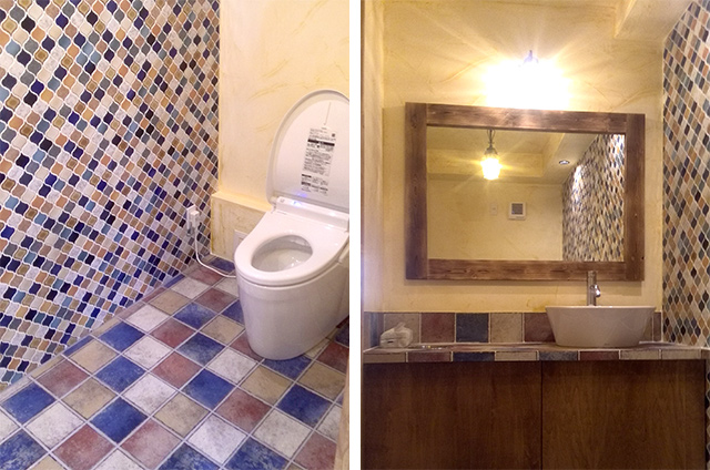 ・壁はモザイクタイルをポイントに使い、他はフランス製のしっくいでデザインしました。床はハンドメイドタイルを4色組み合わせて貼り、手洗いは貼り方を替えてデザイン。