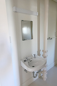 実は洗面台化粧台の裏は壁が出っ張っているのですが、それを隠すために化粧ベニヤと小口テープで壁を前に出しております。