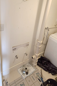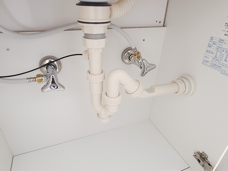 排水が右側にあった為、収納の中で排水方向を変えています。